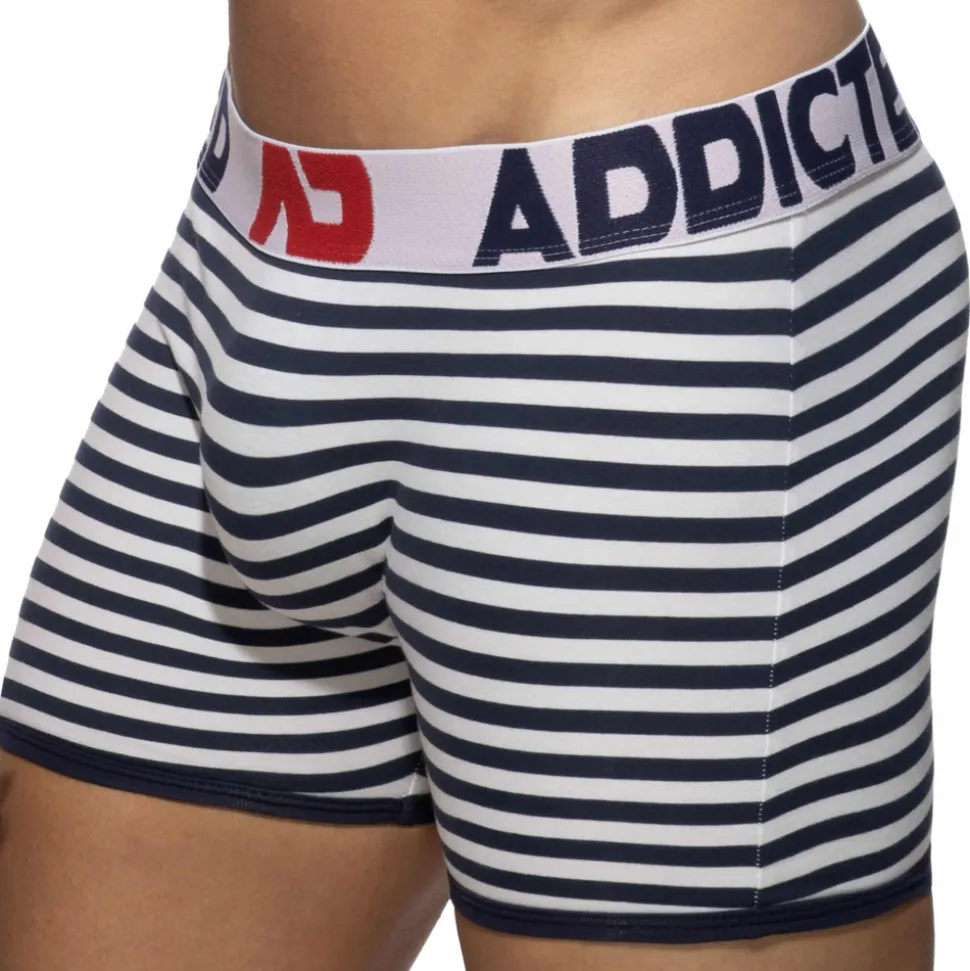 Boxer long en coton doux, léger et confortable. Rayures nautiques. Poche frontale moulée sans couture pour un confort optimal. Large ceinture élastique en jacquard signée Addicted.