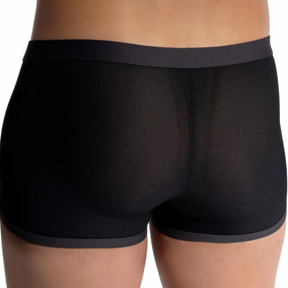 Boxer court en micro-mesh respirant, ultra extensible et confortable. Poche frontale préformée, non doublée. Détails de couleur contrastée. Ceinture élastique avec étiquette Olaf Benz.
