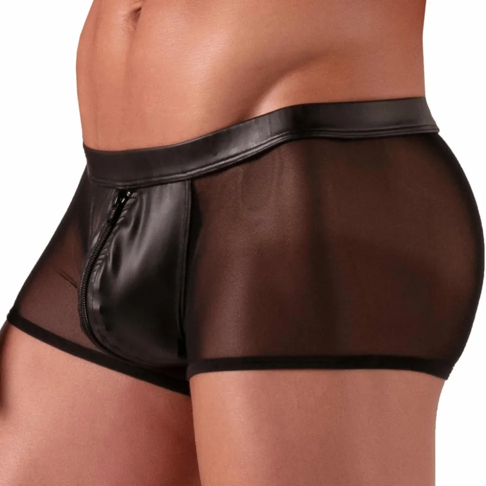 Boxer sexy en résille extensible et transparente. Poche frontale en simili-cuir avec fermeture Eclair fonctionnelle. Ceinture élastique recouverte. Petite poche secrète. Fabrication française.