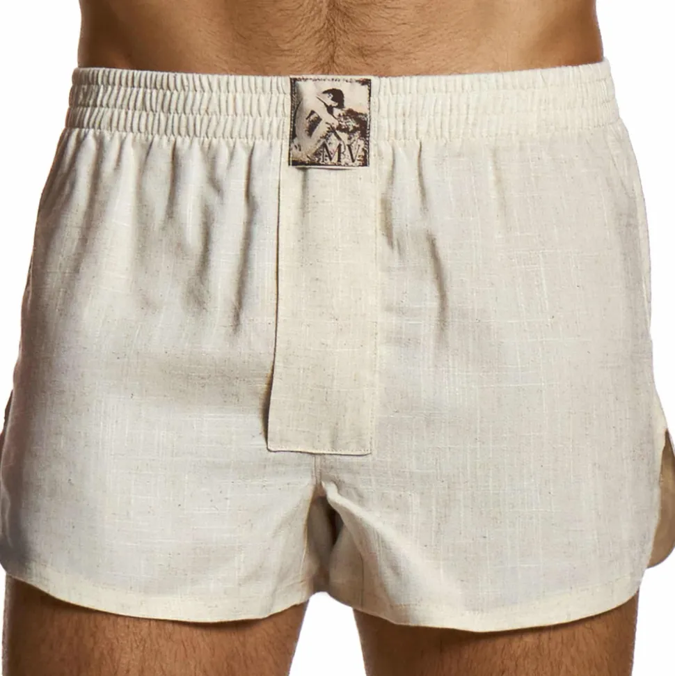 Caleçon en mélange tissé de lin et de viscose. Tissu respectueux de la peau, respirant, anti-transpirant et hypollargénique. Braguette fonctionnelle avec un bouton. Etiquette MV sur la ceinture élastique recouverte.