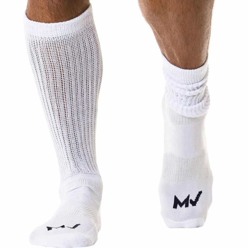 Chaussettes montantes en coton côtelé ultra doux, absorbant, et agréable à porter. Gros logo MV sur la pointe. Taille S/M : 39-42. L/XL : 43-46.