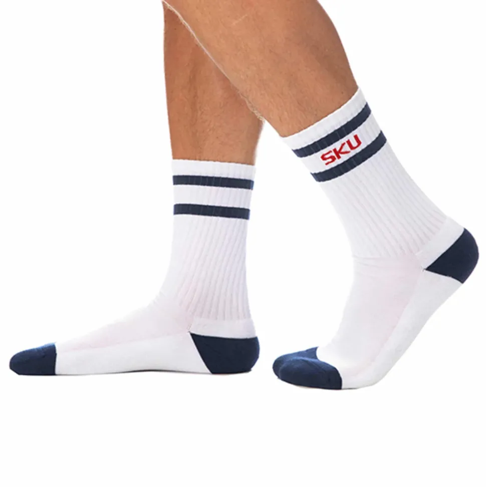 Chaussettes de sport mi-mollet de qualité premium. Coton côtelé ultra doux et absorbant. Rayures, talons et pointes de couleur contrastée. Semelles renforcées. Logo SKU sur la cheville. Made in Portugal. 2 tailles : 39-42 et 43-46.
