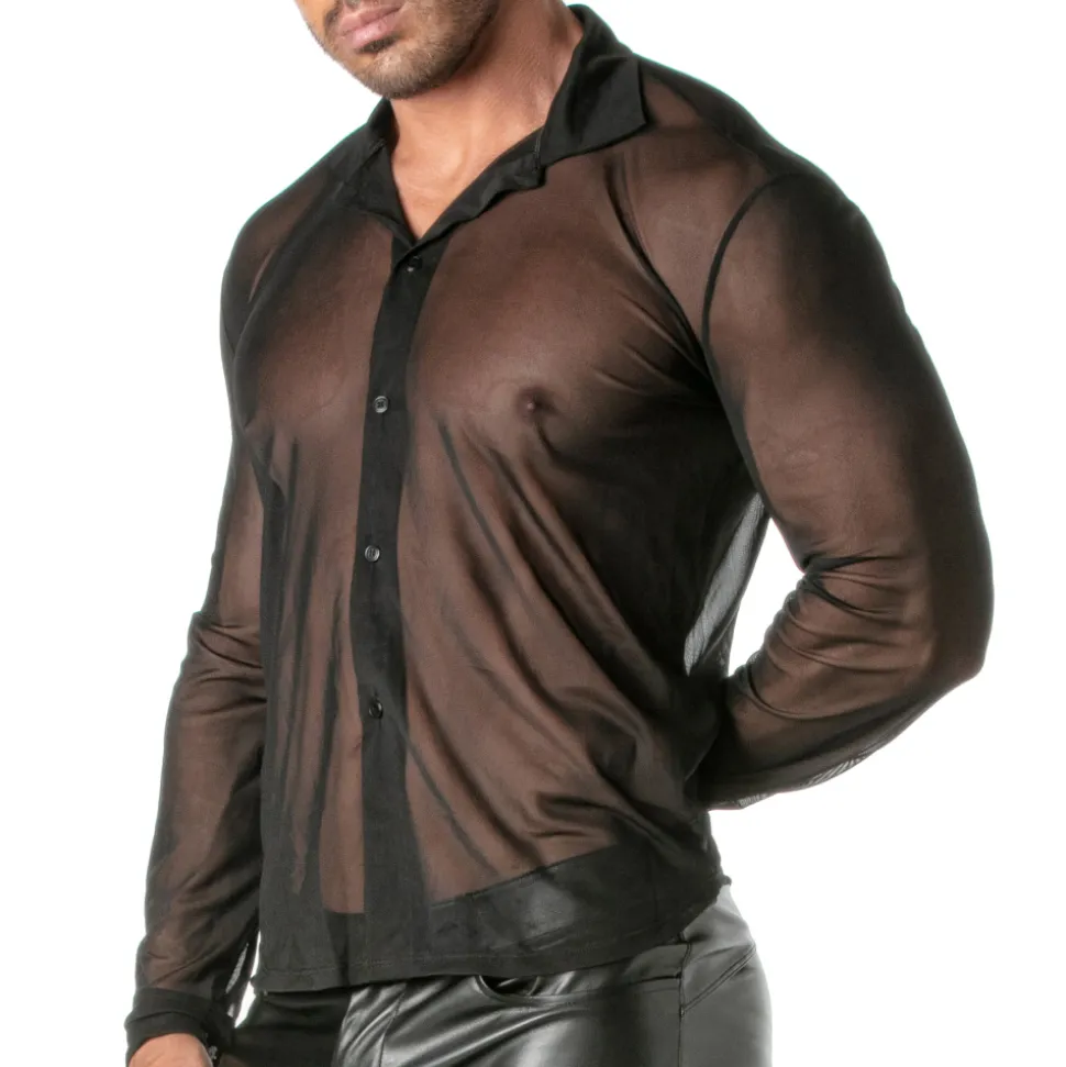 Chemise provocante en résille extensible et transparente. Coupe cintrée. Manches longues. Patte 5 boutons. Etiquette TOF Paris. Fabrication française.