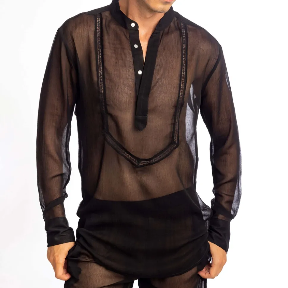 Chemise tunique raffinée en mousseline légère et totalement transparente. Détails en dentelle. Col tunisien à 3 boutons. Manches longues avec poignets.