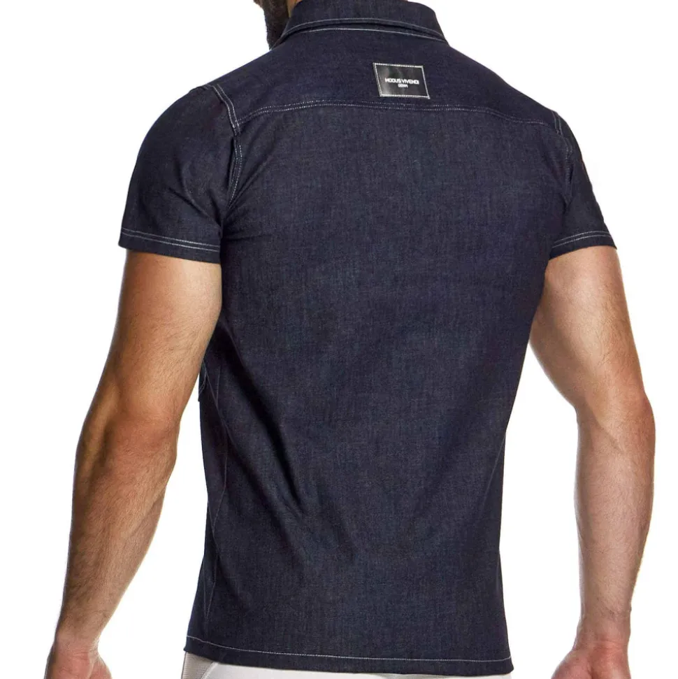 Chemise cintrée à manches courtes en véritable jean stretch brut. Fermeture par 6 boutons métalliques. 2 poches sur la poitrine. Surpiqûres contrastées. Etiquette Modus Vivendi argentée cousue dans le dos. Note : la couleur s’estompe à l’usage. Laver séparément.