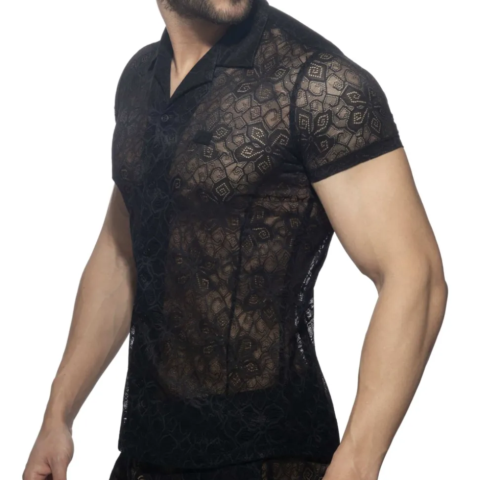 Chemisette très luxueux en dentelle transparente décorée d’un motif floral. Coupe cintrée. Fermeture 5 boutons. Logo Addicted en silicone sur la poitrine gauche.