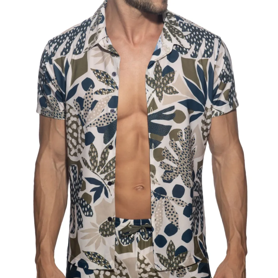 Chemise cintrée en microfibre respirante, douce et ultra légère. Imprimé tropical dans les tons kaki et bleu sur fond beige. Manches courtes. Fermeture 6 boutons. Etiquette AD en silicone sur la manche gauche.