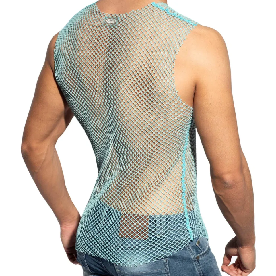 Débardeur très sexy en résille extensible et robuste à maillage large, façon filet de pêche. Coupe ajustée, arrondie en bas pour un tombé parfait. Finitions brutes. Etiquette ES Collection en silicone dans le dos.