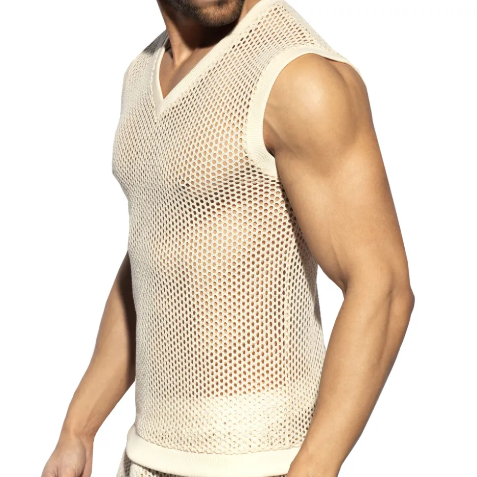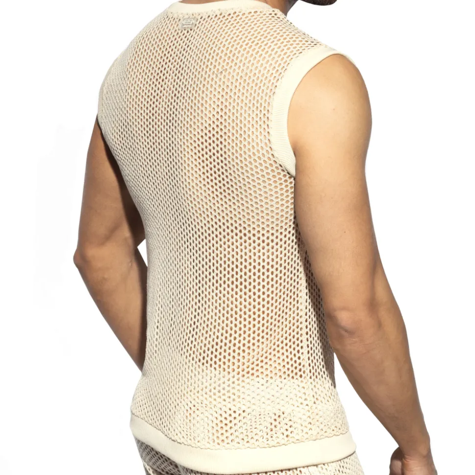 Débardeur en crochet épais et transparent. Tissu tricoté, confortable et luxueux, en pur coton. Col en V profond. Logo ES Collection en silicone au dos.
