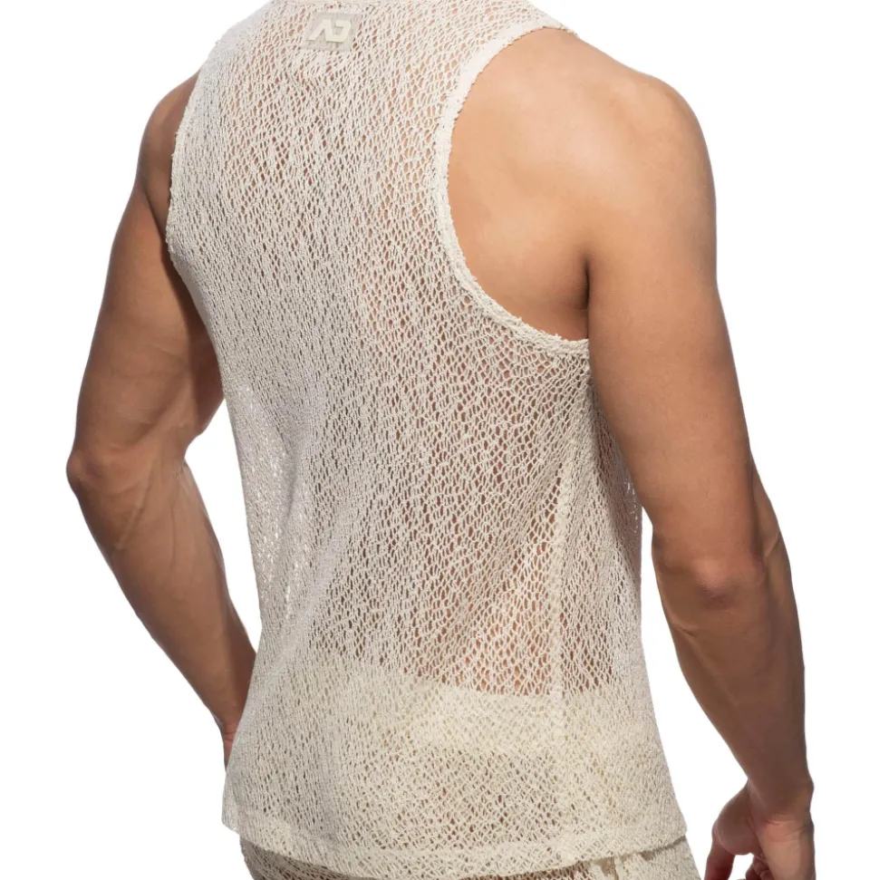 Débardeur en maille ultra légère et respirante à base de coton. Le tissu à motif bohémien dévoile le corps en transparence. Coupe chic et décontractée. Col rond. Logo AD en silicone dans le dos.