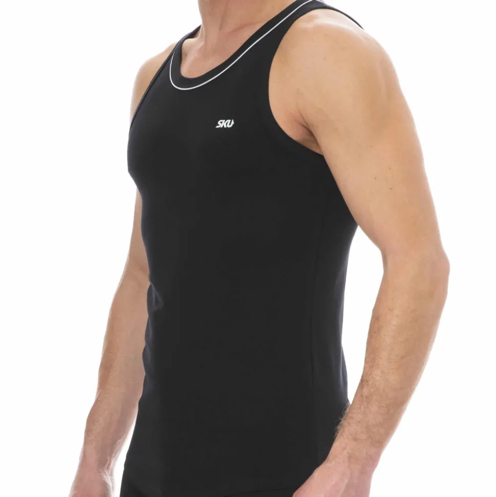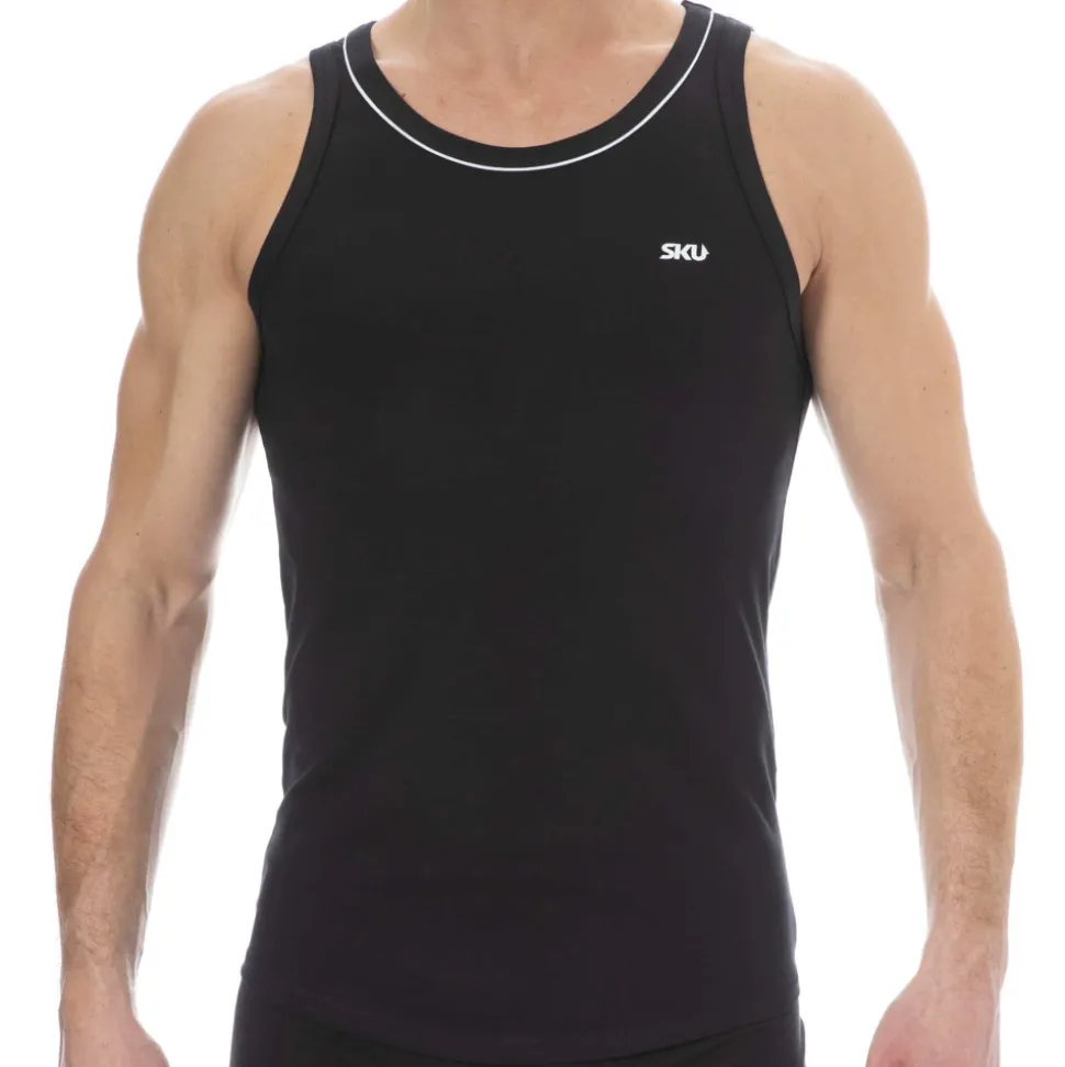 Débardeur sport et sexy en coton premium doux et extensible de couleur intense. Cintré juste comme il faut, il valorisera votre musculature sans gêner vos mouvements. Coupe courte et arrondie en bas, pour tomber parfaitement sur un pantalon. Le col rond est subtilement souligné par un liseré de couleur contrastée. Logo SKU sur la poitrine.