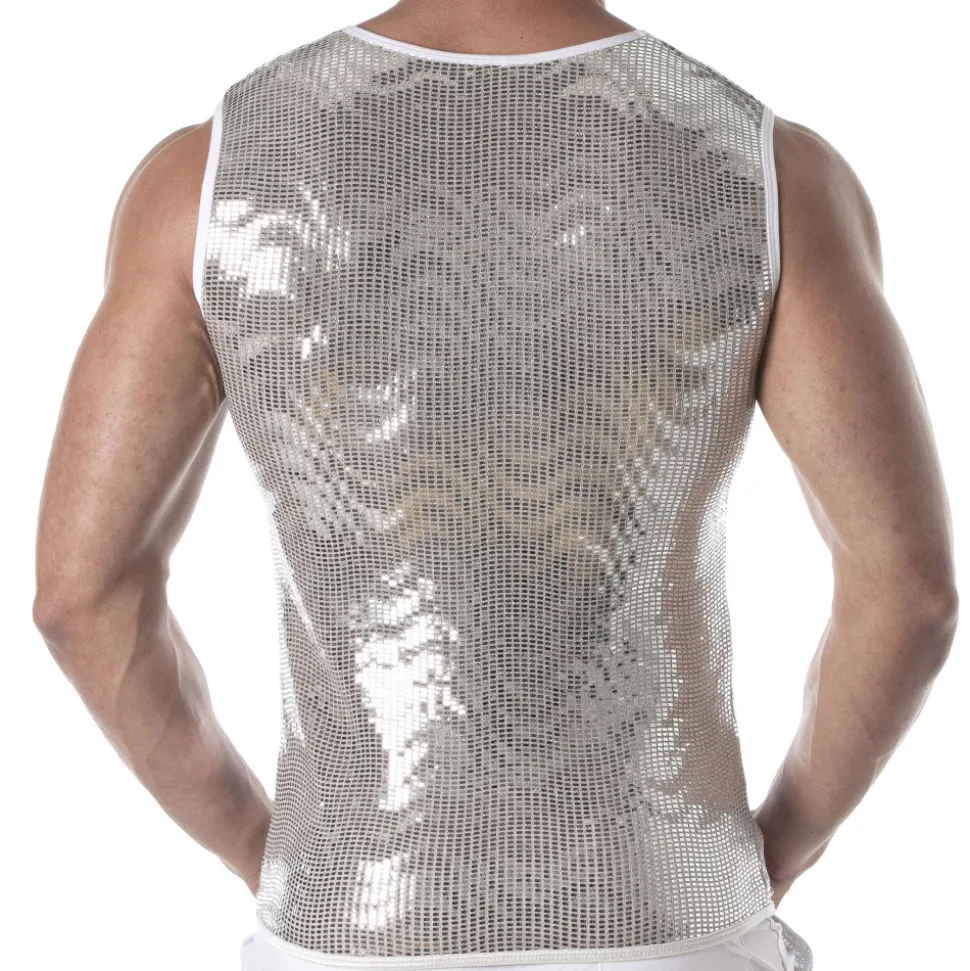 Débardeur sexy en microfibre recouverte de carreaux scintillants pour un effet boule à facette. Bordures contrastées. Col rond. Logo TOF Paris sur la poitrine. Fabrication française. Conseils d’entretien : laver à la main, ne pas sécher en machine, ne pas repasser.