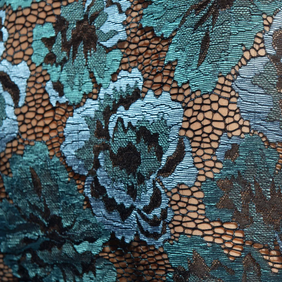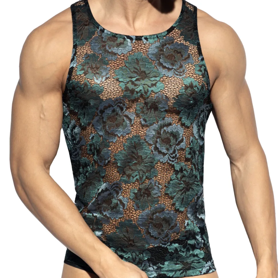 Débardeur luxueux en dentelle transparente décorée d’un délicat motif floral dans les tons verts et bleus. Coupe ajustée et col rond. Logo ES Collection en silicone au dos.