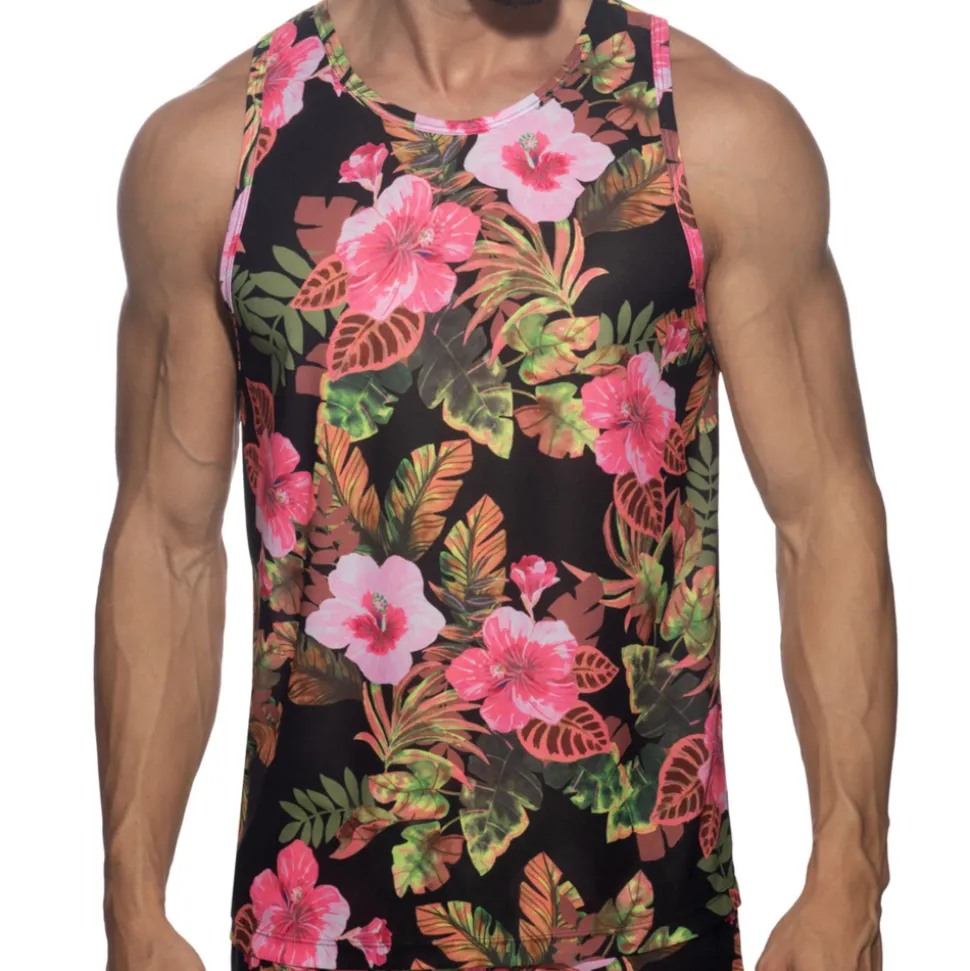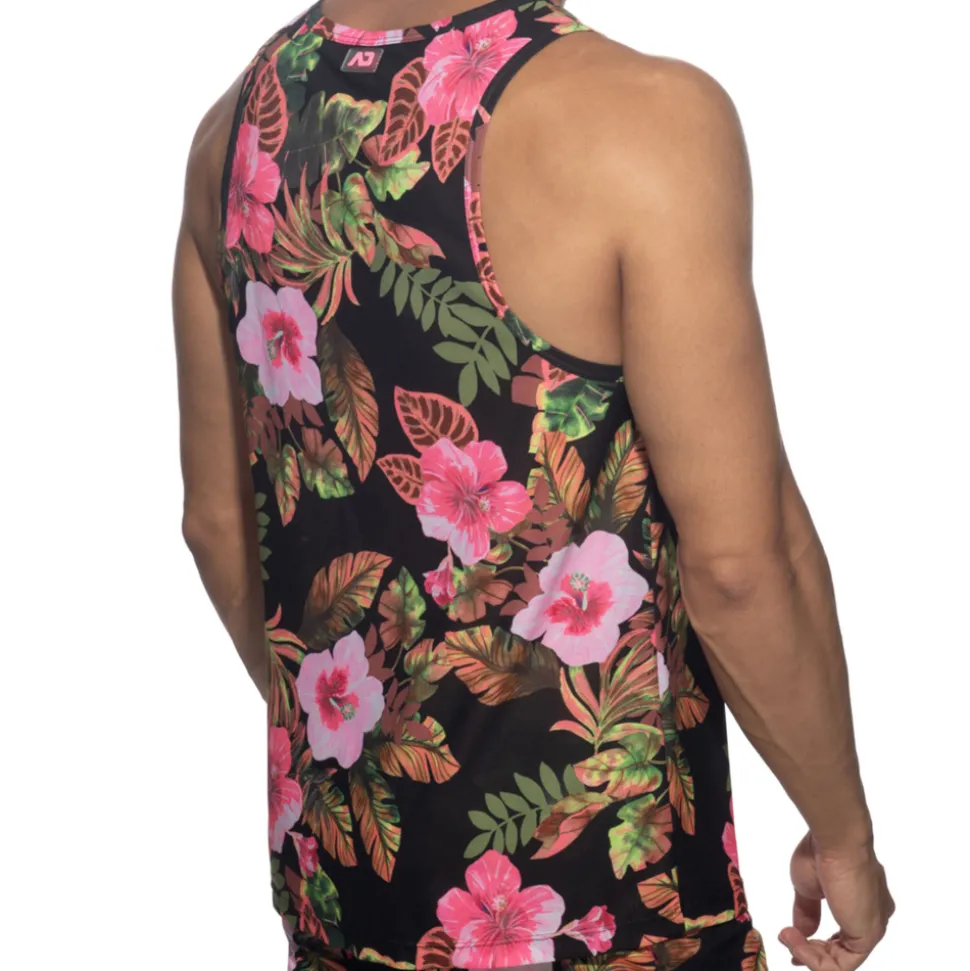 Débardeur en microfibre semi-transparente, douce et légère. Superbe imprimé tropical constitué de fleurs roses sur fond noir. Coupe ajustée, col rond. Etiquette AD en silicone à l’arrière.