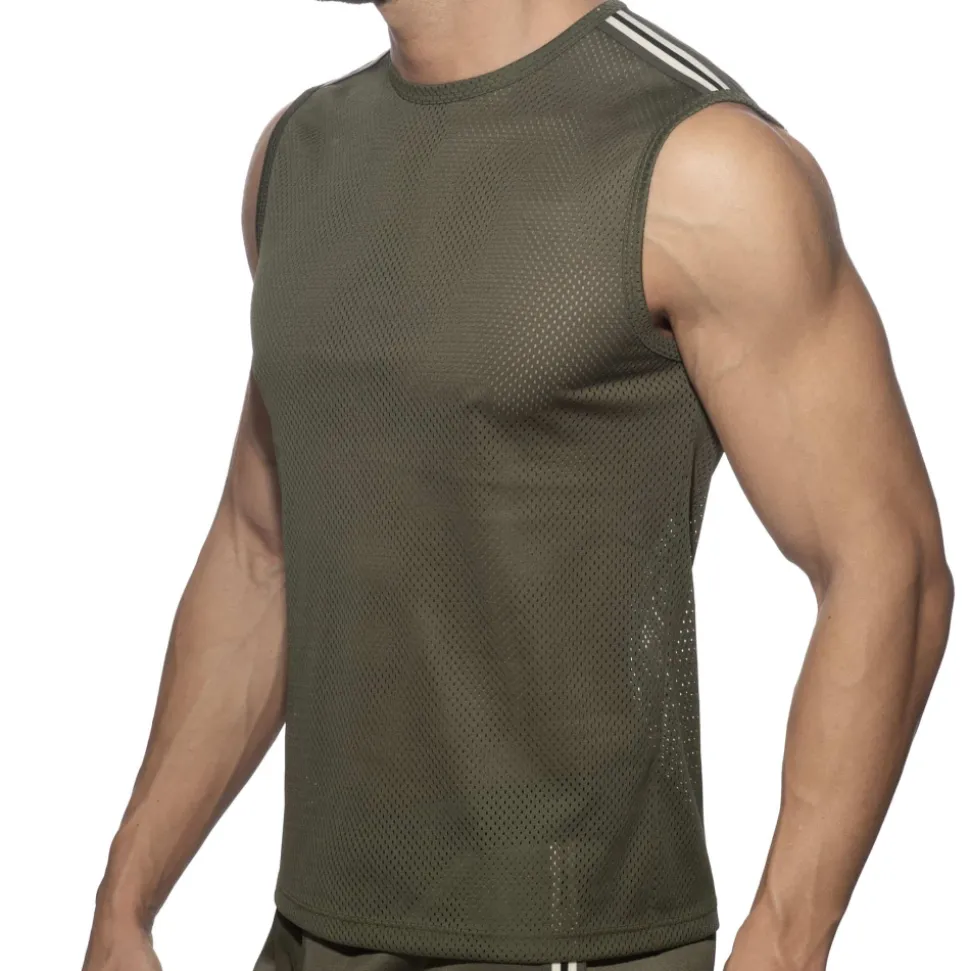 Débardeur sport en résille légère et respirante. Bandes tricolores sur les épaules. Etiquette AD en silicone dans le dos.