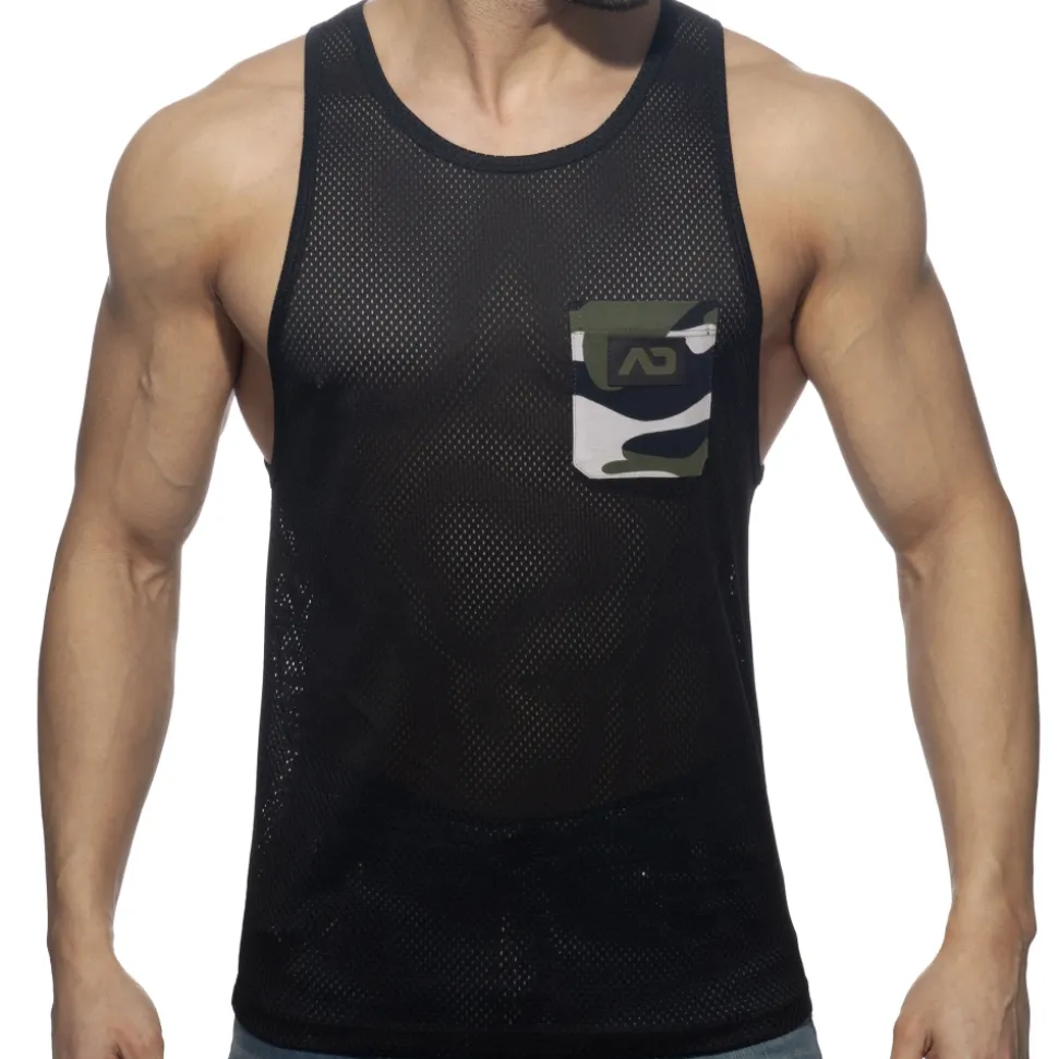 Débardeur en mesh doux et respirant. Poche factice de couleur contrastée sur la poitrine, avec logo AD en silicone. Coupe ajustée, dos nageur et col rond.