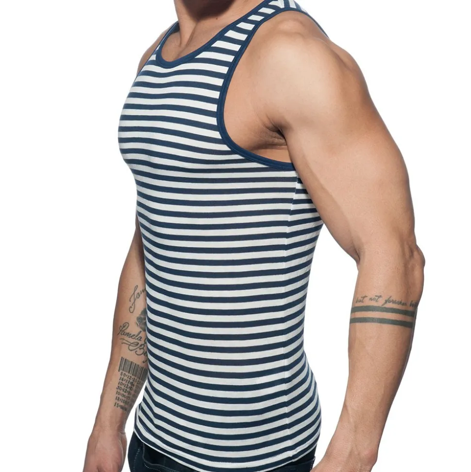 Débardeur très ajusté en mélange doux, frais et soyeux à base de viscose. Imprimé marinère très tendance. Bordures de couleur contrastée. Logo Addicted en silicone dans le dos. Fabriqué à Barcelone.