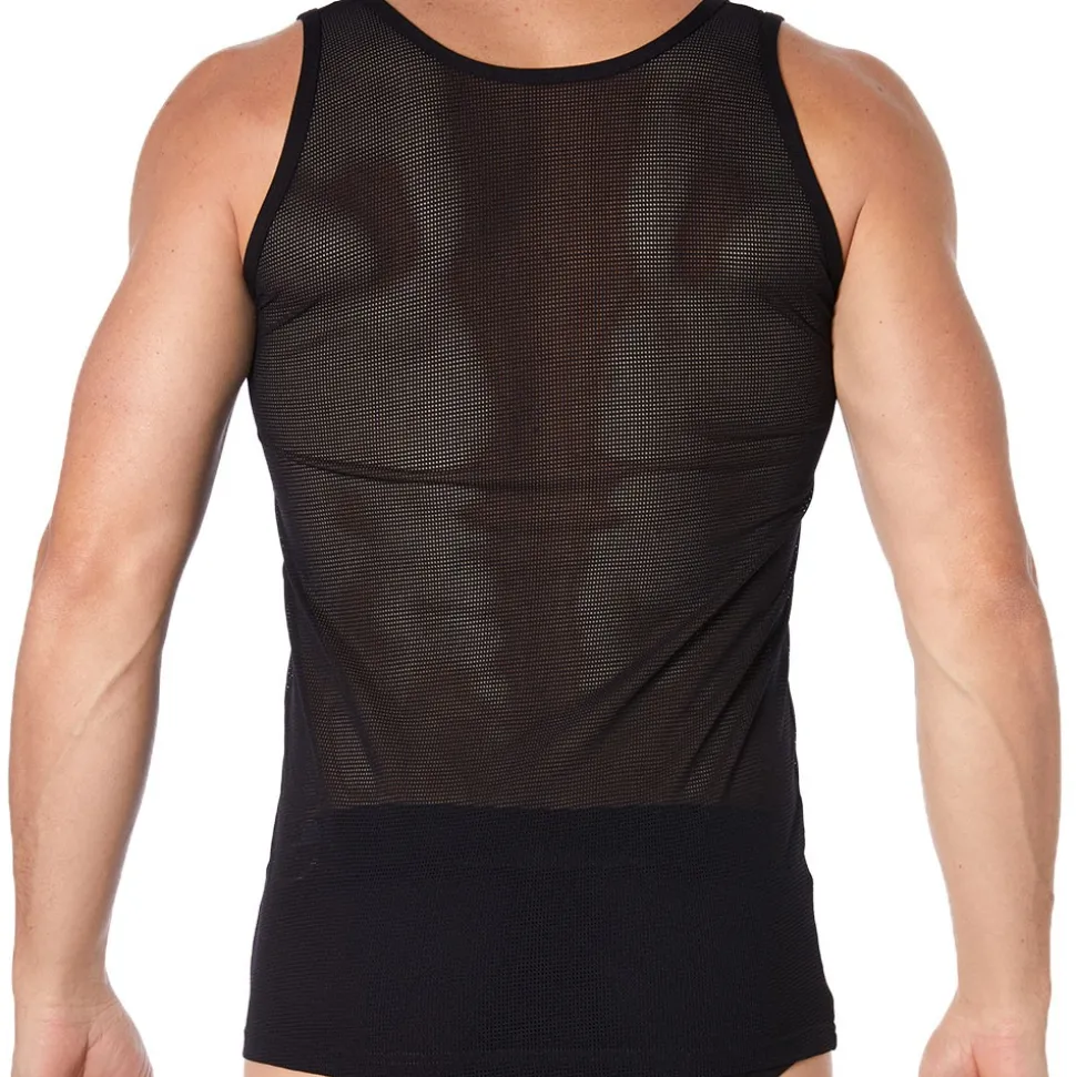 Débardeur très sexy en mesh sport transparent, extensible et respirant, dont le maillage laisse peu de place à l’imagination. Col rond. Coupe très ajustée.