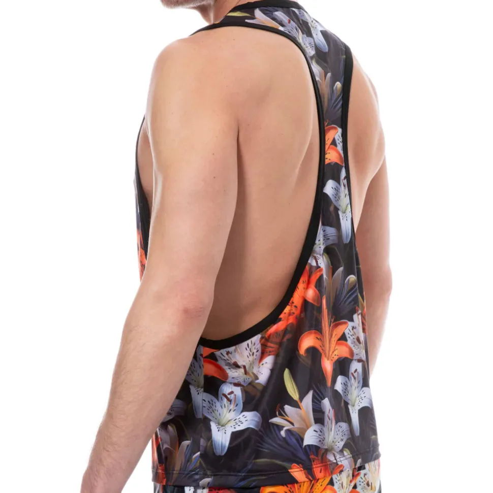 Débardeur sport en microfibre extensible, ultra douce et légère. Superbe imprimé tropical original et intense. Coupe sexy dévoilant le corps grâce au col profond, aux larges ouvertures sous les bras et au dos nageur.