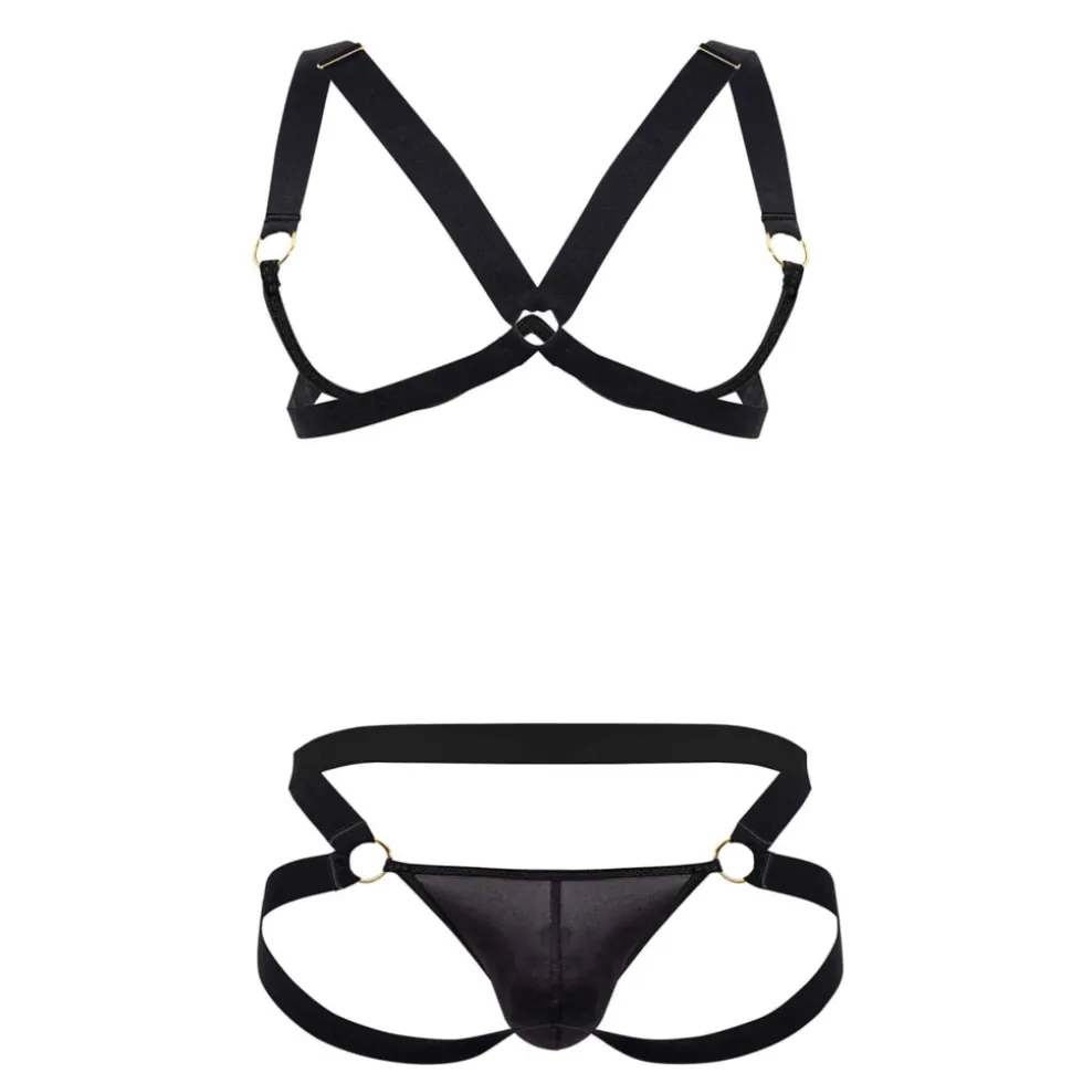 Ensemble sexy et provocant composé d’un harnais soutien-gorge et d’un jockstrap en microfibre extensible. Le harnais soutient la poitrine à l’aide d’une armature rigide. Bandes élastiques reliées par des anneaux métalliques. Bretelles réglables. Poche frontale non doublée.