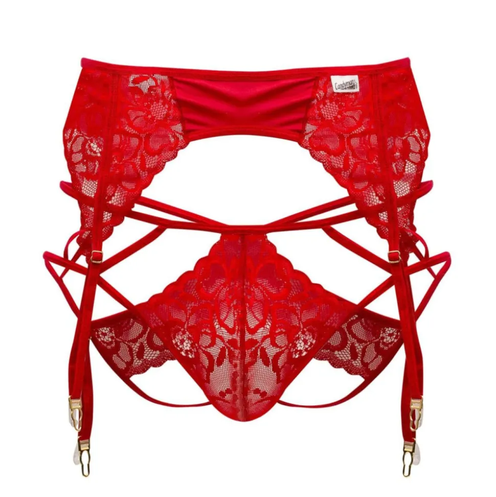 Ensemble sexy et provocant composé d’un porte-jarretelle et d’un jocktrap en dentelle florale transparente. Bretelles fines. Clips métalliques pour attacher les bas (vendus séparément). Jockstrap avec poche frontale non doublée.