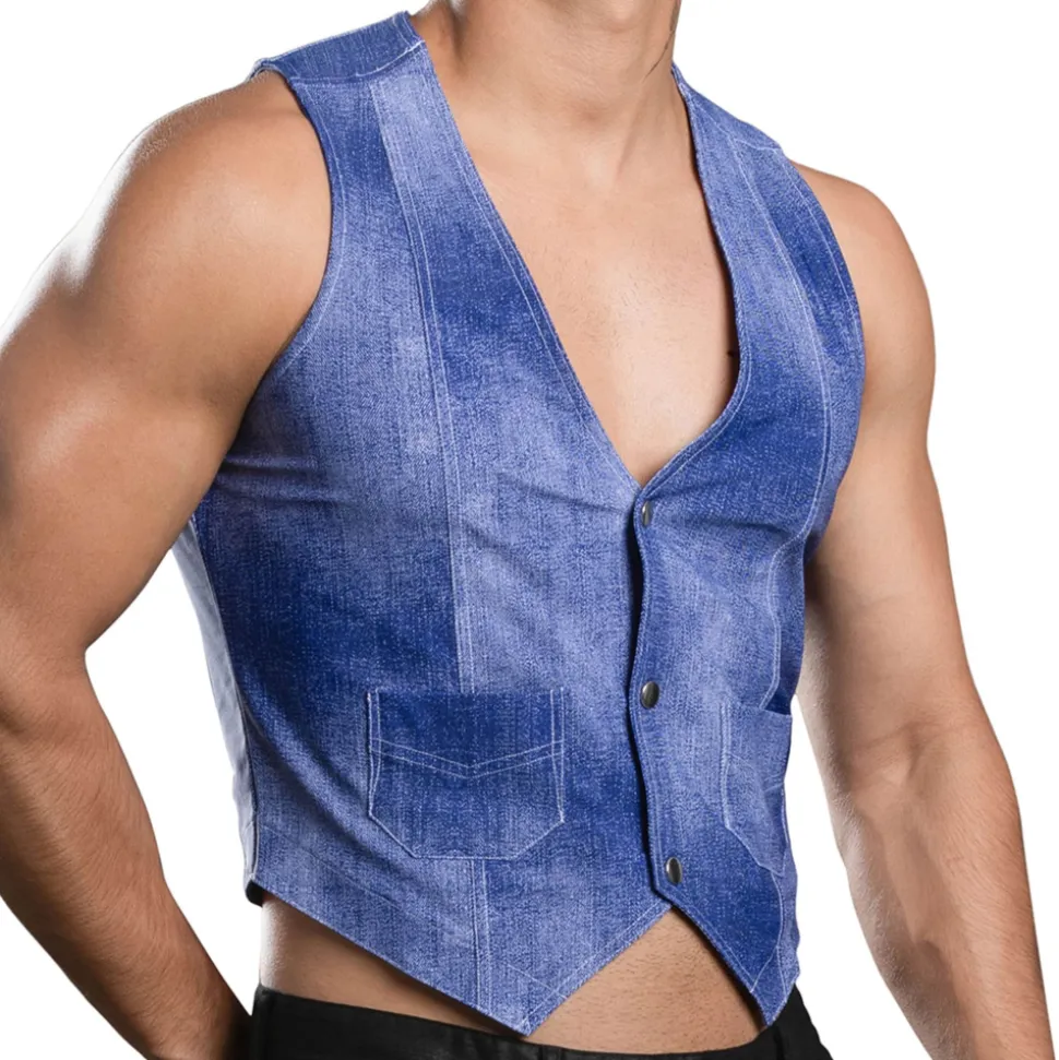 Gilet sans manches en microfibre extensible imitant le jean. Coupe raccourcie pour dévoiler vos abdos. Fermeture par trois boutons pression en métal. Deux poches plaquées à l’avant. Patte de serrage au dos pour l’ajustement. Surpiqûres de couleur contrastée.
