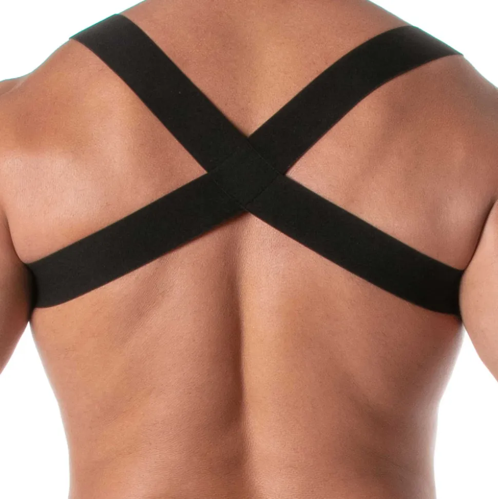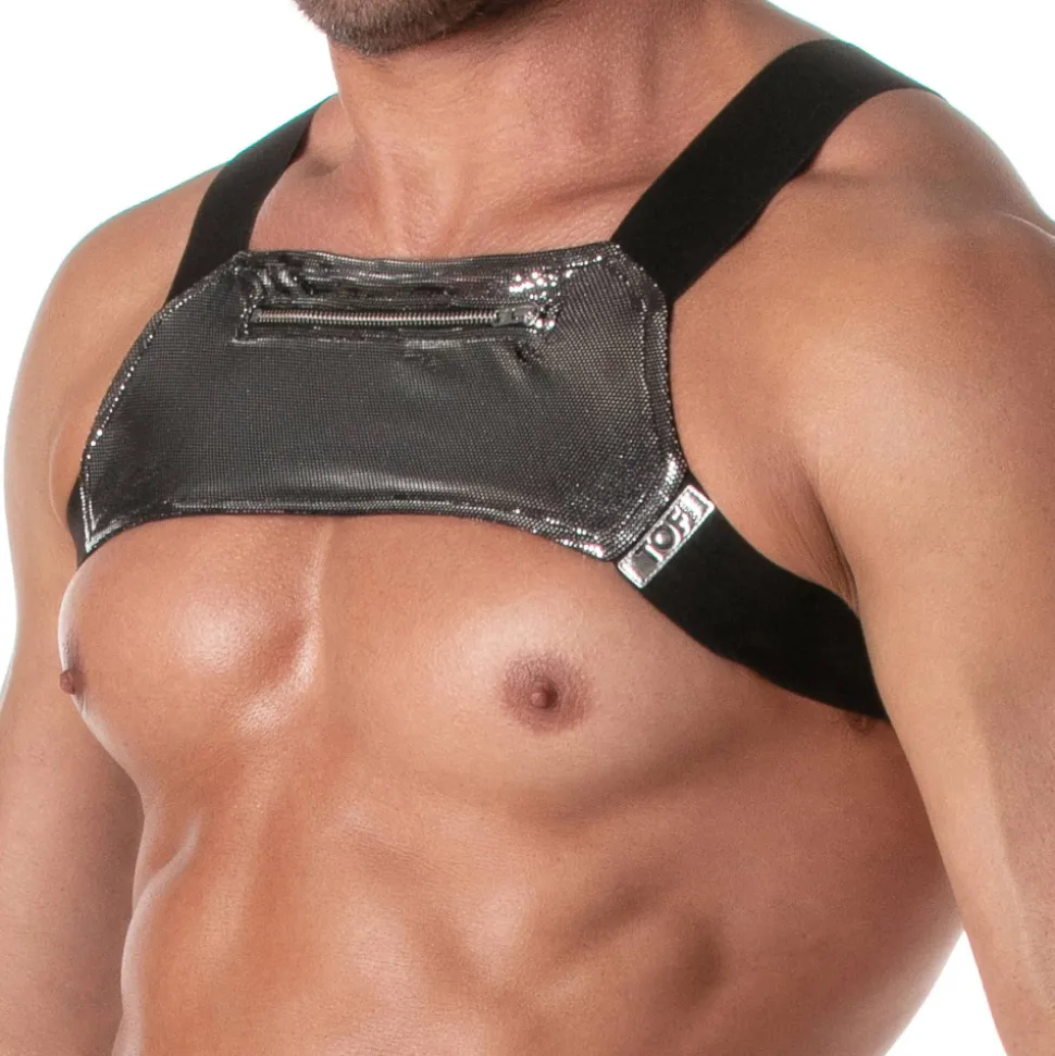 Harnais sexy et provocant en microfibre extensible pour un look fetish. Tissu orné de ronds brillants qui captent la lumière avec élégance. Elastiques constratsés extensibles croisés dans le dos. Poche à fermeture éclair sur la poitrine. Etiquette en simili-cuir signée TOF Paris.