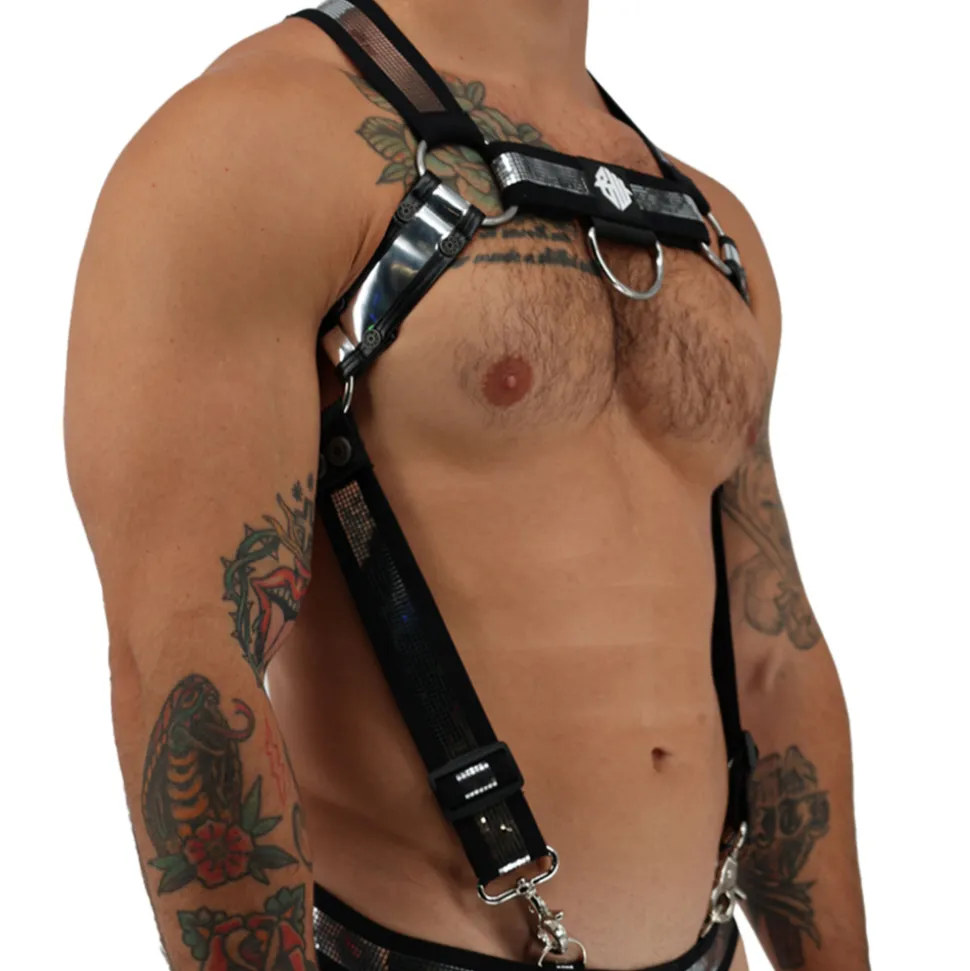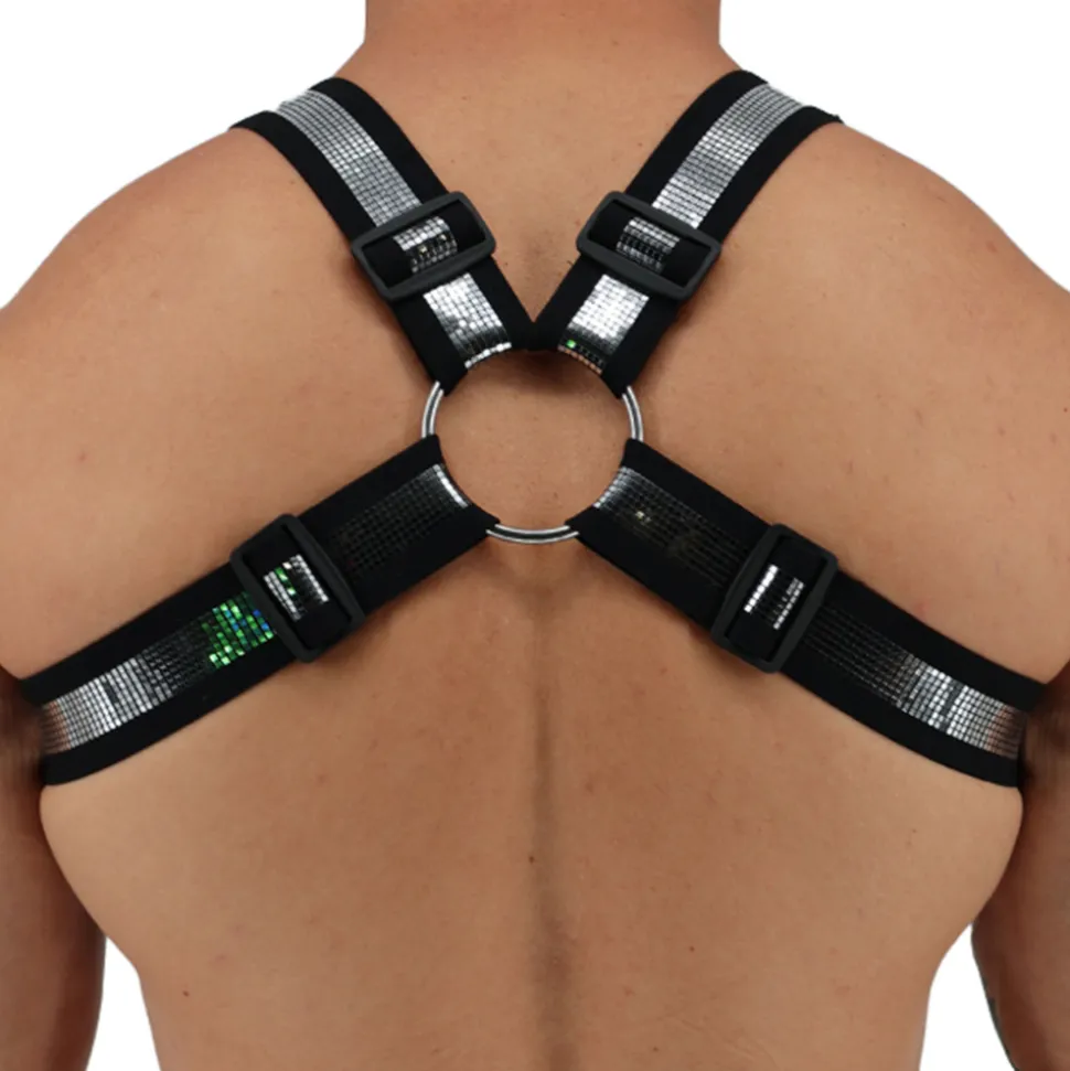 Harnais sexy composé de bandes élastiques ajustables en microfibre recouverte de carreaux scintillants pour un effet boule à facette. Bordures de couleur contrastée. Patchs Breedwell en PVC de qualité supérieure. 6 anneaux métalliques. Bande horizontale amovible sur la poitrine. Peut être attaché au jock strap Illuminator (vendu séparément) grâce à 2 mousquetons.