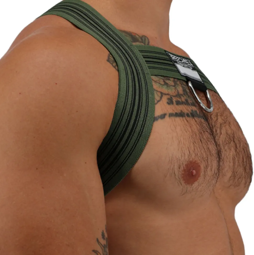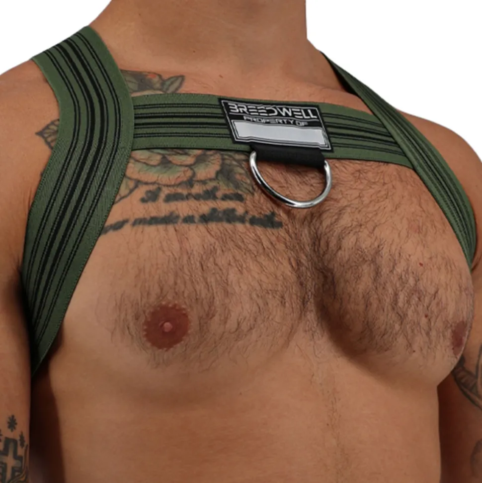 Harnais sexy constitué de bandes élastiques larges formant un X dans le dos. Devant, la forme en H met en valeur vos pectoraux. Patch Breedwell à l’avant avec anneau métallique.