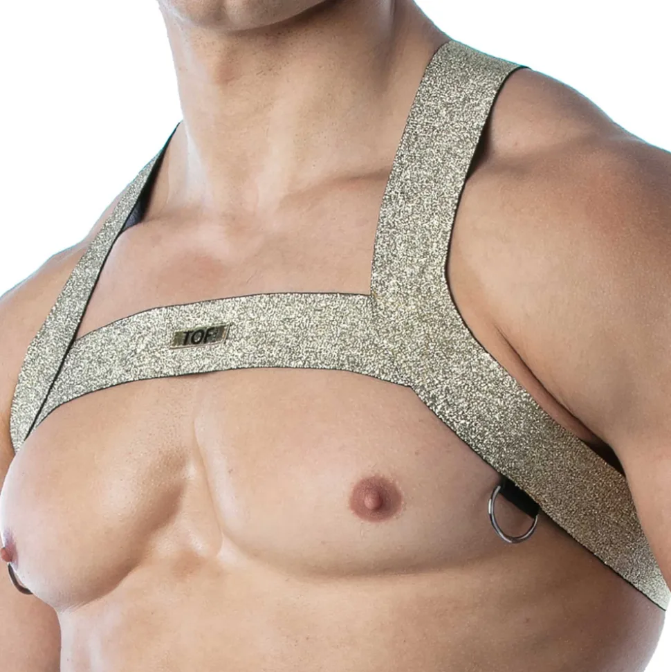 Harnais constitué de bandes élastique en fils métallisés Lurex qui forment un X dans le dos. Devant, la forme en H met en valeur vos pectoraux. 2 anneaux métalliques pour accrocher des bretelles ou autre accessoire. Etiquette TOF en silicone. Fabrication française.