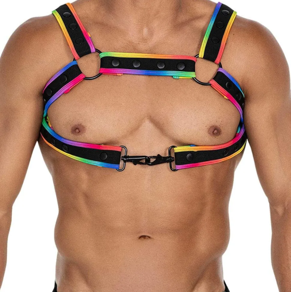 Harnais sexy et original constitué de sangles en néoprène réglables par boutons-pression. Bordures de couleur intense. 6 anneaux métalliques. 2 bretelles amovibles permettent d’attacher le harnais à un sous-vêtement grâce à 2 mousquetons. Taille unique.
