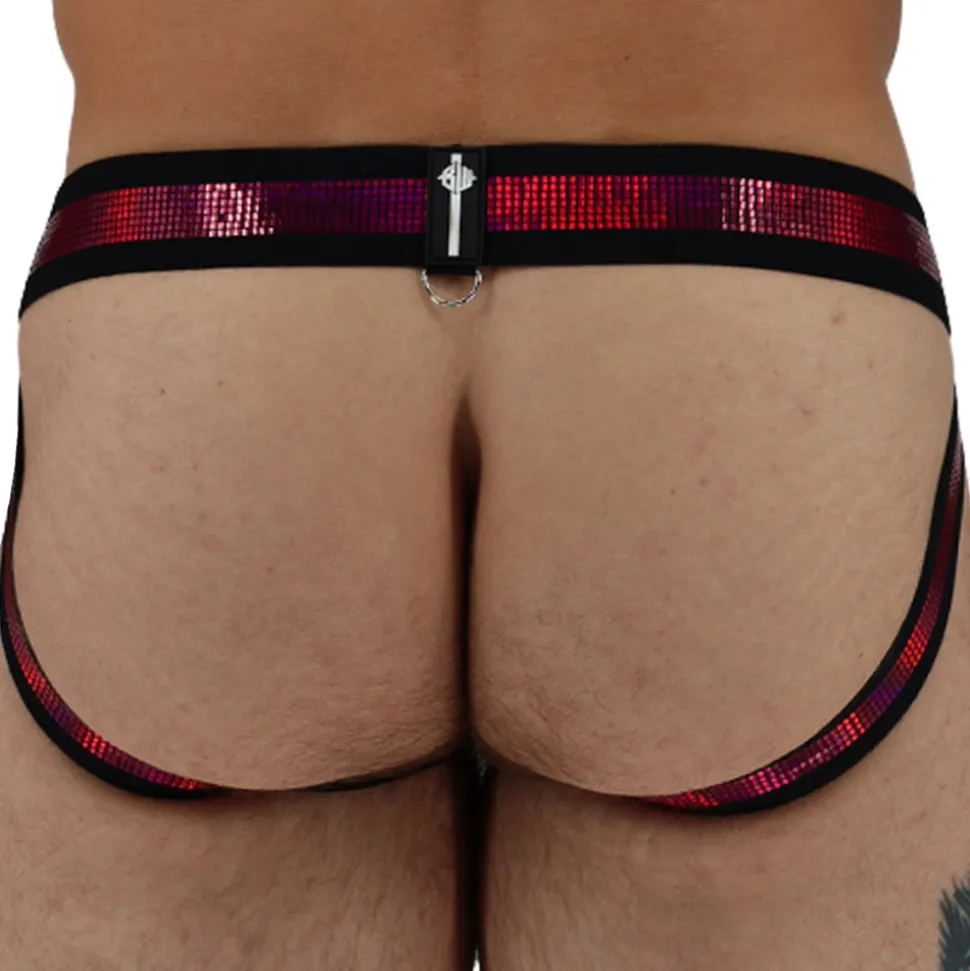 Jockstrap en microfibre extensible, légère et respirante. Poche soulignant le volume frontal, grâce au passepoil vertical en son milieu et aux empiècements latéraux en résille de couleur contrastée. Bandes élastiques ornées de carreaux scintillants pour un effet boule à facette. Anneaux métalliques pour attacher un harnais (vendu séparément). Patchs Breedwell en PVC de qualité supérieure.