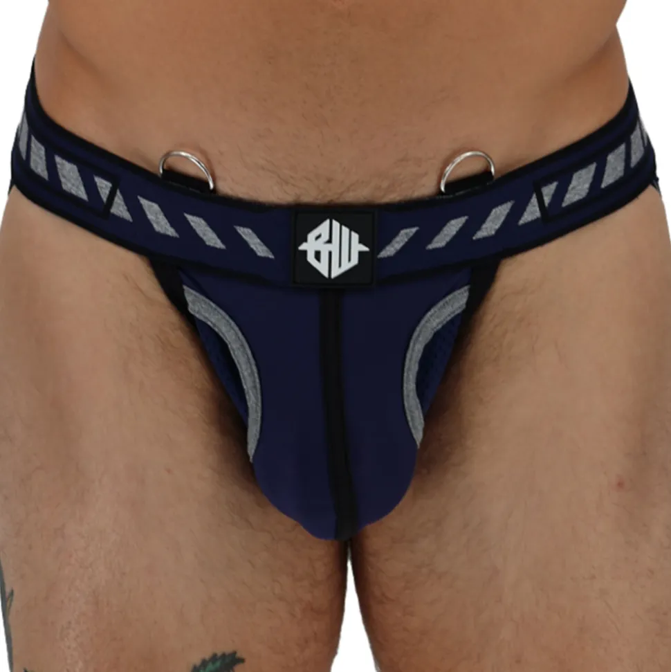 Jockstrap sexy et sophistiqué en jersey épais et doux de qualité supérieure. Bandes contrastées et empiècements en résille soulignent le volume de la poche frontale. Empiècements en mesh à l’arrière. Ceinture élastique graphique avec anneaux métalliques pour attacher un harnais body (vendu séparément). Patchs Breedwell en PVC.