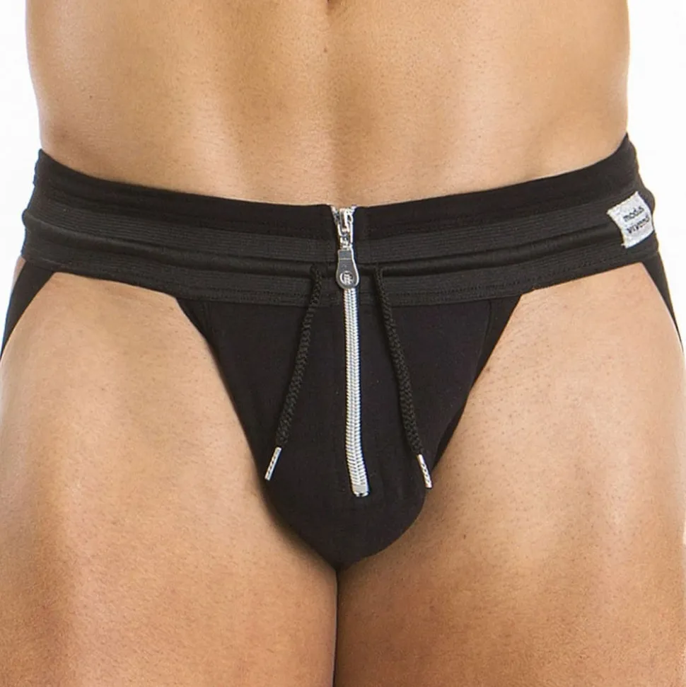 Jockstrap doté d’une fermeture Eclair sur la poche frontale. Cordon de serrage pour ajuster la taille. Logo Modus Vivendi sur le côté gauche.