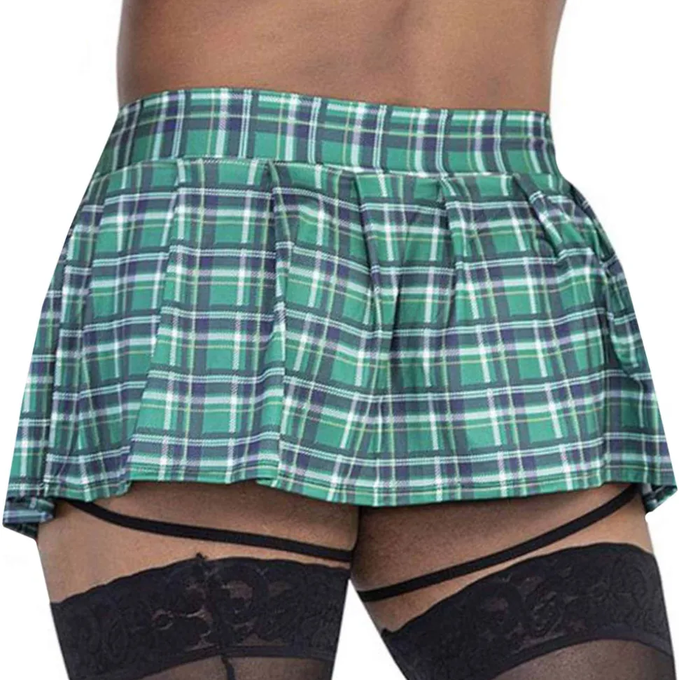 Mini jupe plissée en microfibre douce et extensible imprimée d’un motif tartan. Livrée avec un porte-jarretelle constitué de fines bandes élastiques reliées par des boucles métalliques en forme de cœur. Des pinces permettent d’attacher des bas (vendus séparément).