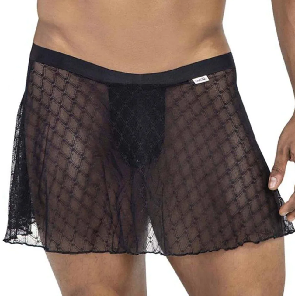 Jupe très sexy en dentelle extensible transparente, ornée d’un motif géométrique. String intérieur en mesh pour plus de maintien et de confort. Ceinture élastique.