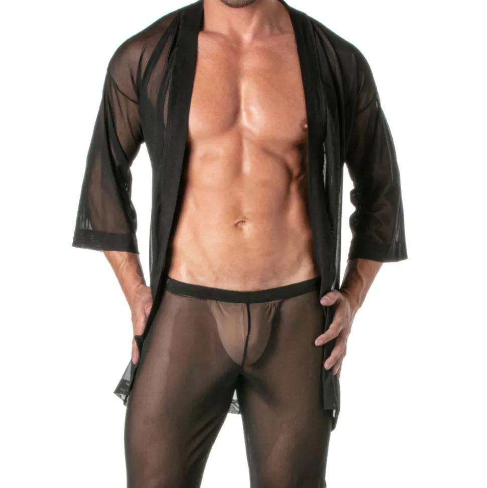Kimono provocant en résille extensible et transparente. Manches 3/4. Passants et ceinture à la taille. Fabrication française.