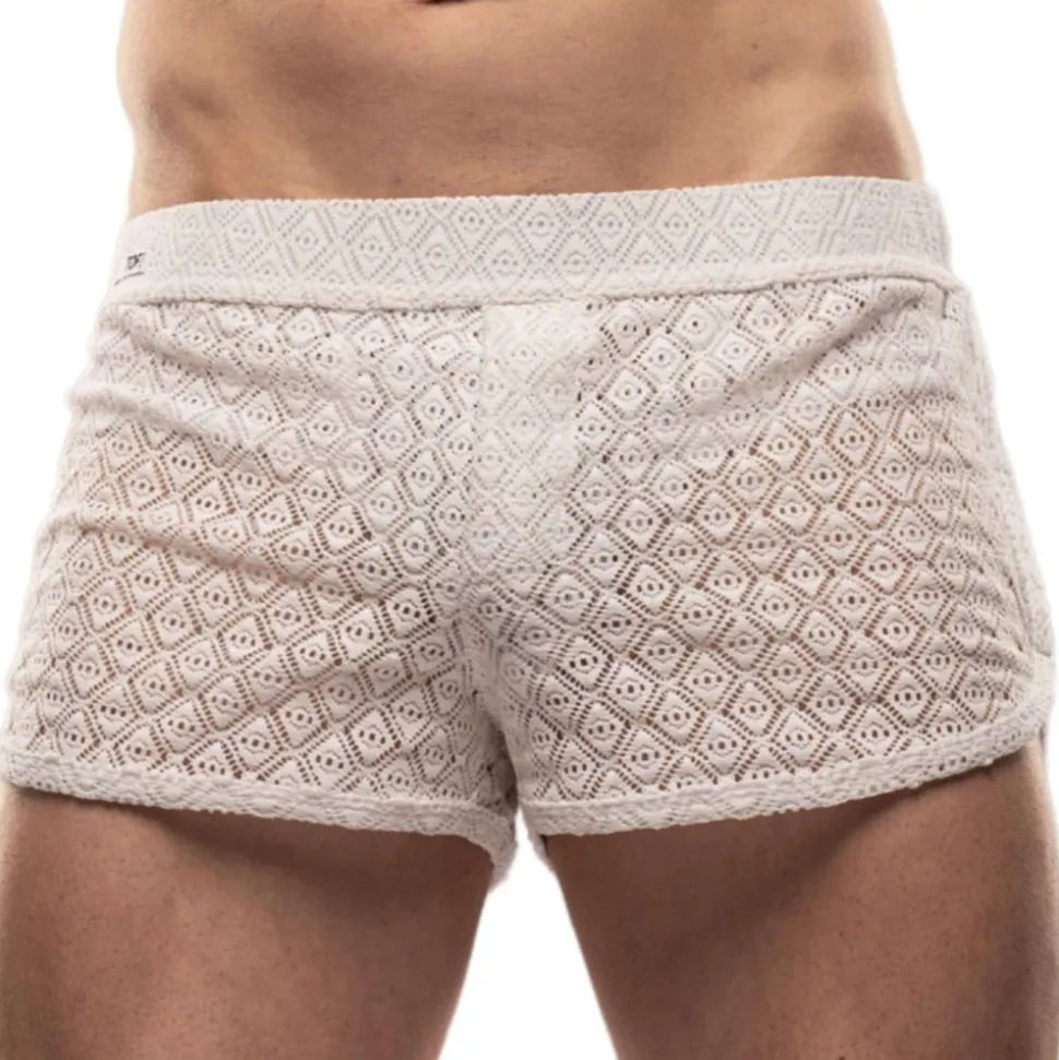 Short d’été en dentelle semi-transparente décorée d’un motif géométrique. Coupe rétro, mini et taille basse. Ceinture élastique recouverte avec étiquette TOF Paris sur la hanche droite. Braguette factice. Fabrication française.