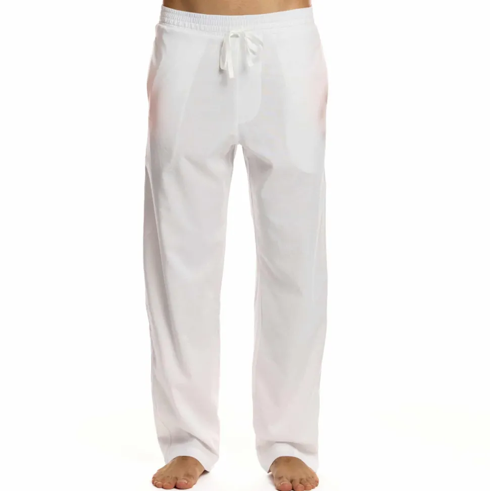 Pantalon droit en tissu léger à base de lin. 3 poches. Ceinture élastique avec cordon de serrage. Etiquette MV cousue à l’arrière.
