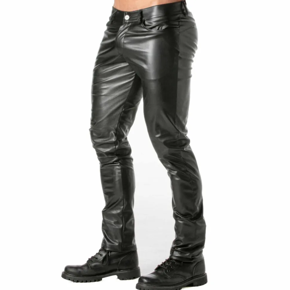 Pantalon sexy en simili-cuir extensible pour un look fetish. Coupe taille basse et ajustée. 5 poches. Braguette à bouton et fermeture Eclair. 6 passants de ceinture. Fabrication française.