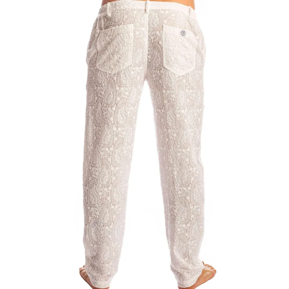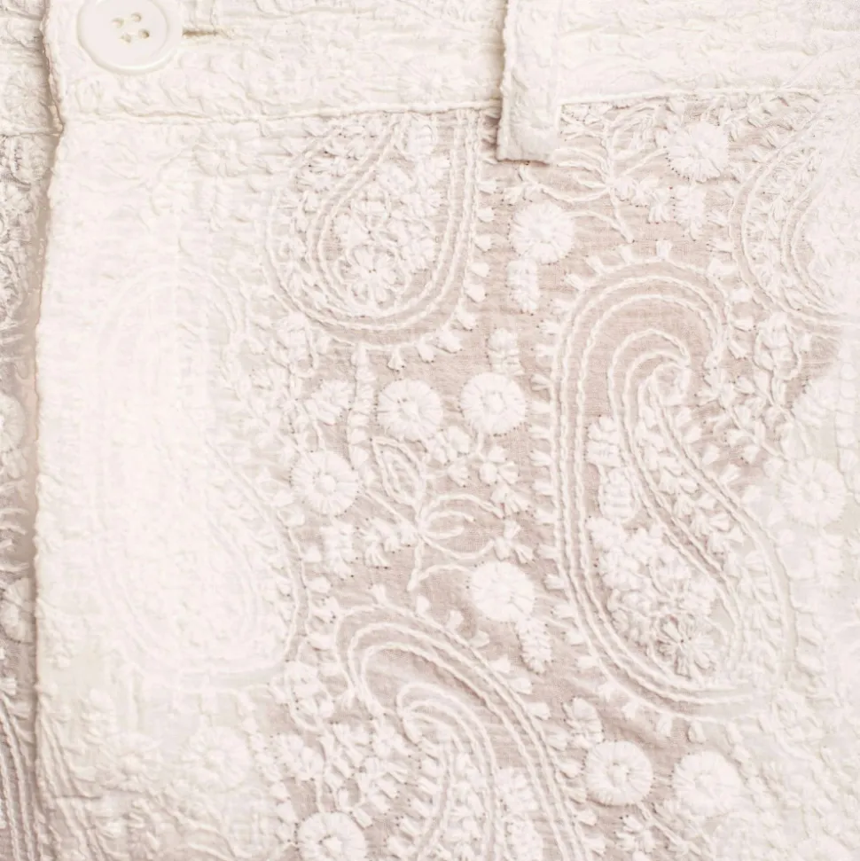 Pantalon luxueux, élégant et raffiné en pur coton, léger et confortable. Motif d’inspiration orientale brodé sur l’intégralité sur short. Coupe droite et taille basse. 4 poches. Braguette à fermeture Eclair et 1 bouton. Passants de ceinture. Bandes élastiquées sur les côtés pour l’ajustement.