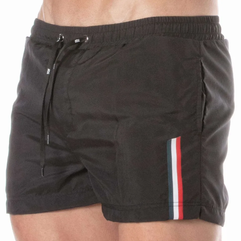 Short de bain taille basse très confortable en microfibre douce et légère séchant rapidement. Coupe mi-cuisse très ajustée. Bandes tricolores sur la cuisse gauche et la fesse droite. Plaque métallique TOF Paris. Braguette factice. 2 poches sur les côtés et une poche arrière. Slip intérieur en mesh. Ceinture élastique avec cordon de serrage. Fabrication française.