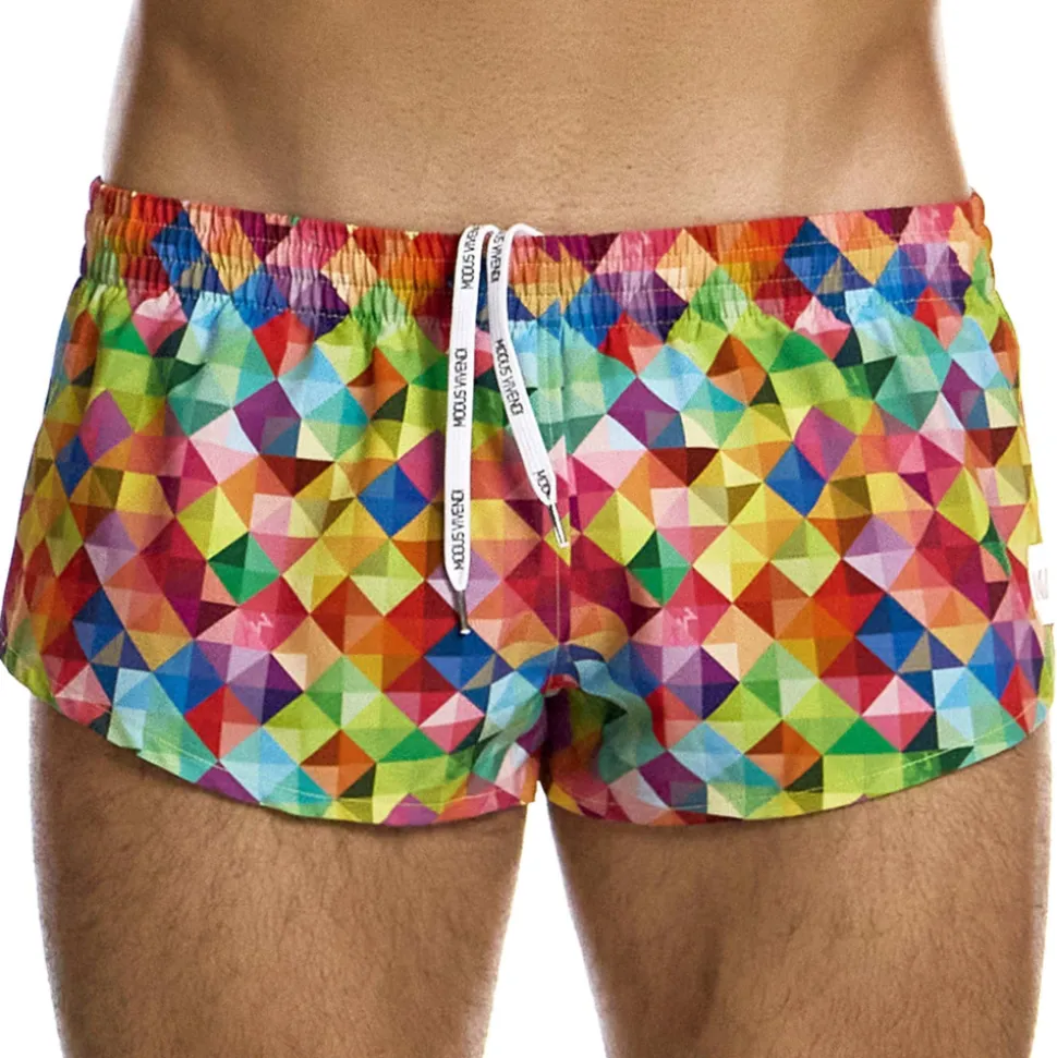 Short de bain en microfibre séchant rapidement et résistant aux UV. Imprimé géométrique aux couleurs de l’arc-en-ciel. Coupe courte et confortable, échancrée sur les côtés. Slip intérieur pour plus de confort et de maintien. Ceinture élastique avec cordon de serrage intérieur. Etiquette MV en silicone cousue sur la cuisse gauche.