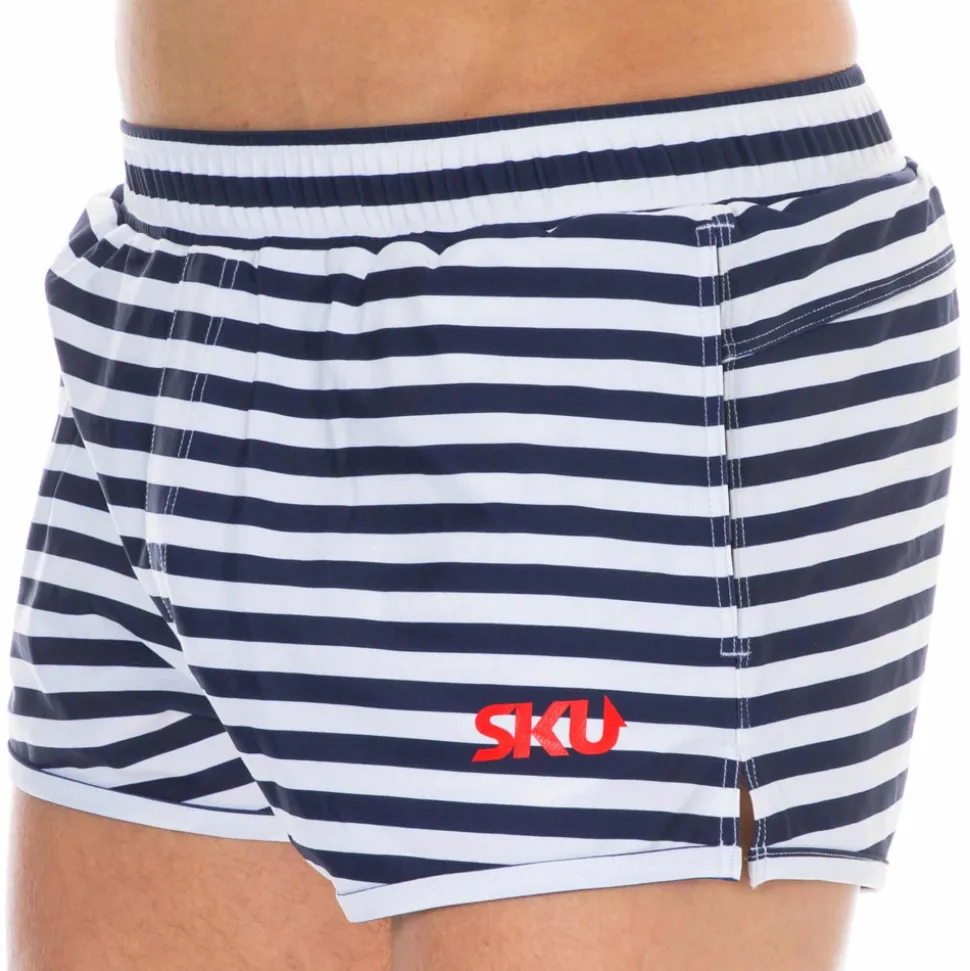 Short de bain sport en microfibre extensible séchant rapidement. Slip intérieur en mesh fin pour plus de confort. Petite fente sur le côté pour une plus grande liberté de mouvement. Logo SKU imprimé sur la cuisse gauche. Braguette factice. Ceinture élastique.