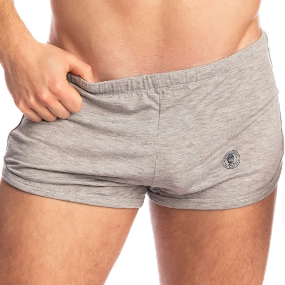 Short très court en coton extensible doux, léger et confortable. Coupe fluide, arrondie sur les côtés. Ceinture élastique recouverte avec cordon de serrage intérieur. Logo L’Homme Invisible sur la cuisse gauche.