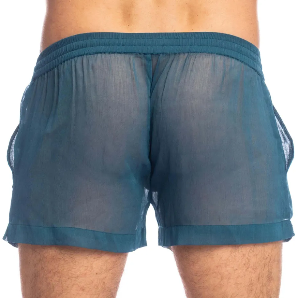 Short d’intérieur raffiné en mousseline légère et totalement transparente. Coupe taille basse, ample et fluide. 2 poches. Ceinture élastique avec cordon de serrage intérieur.