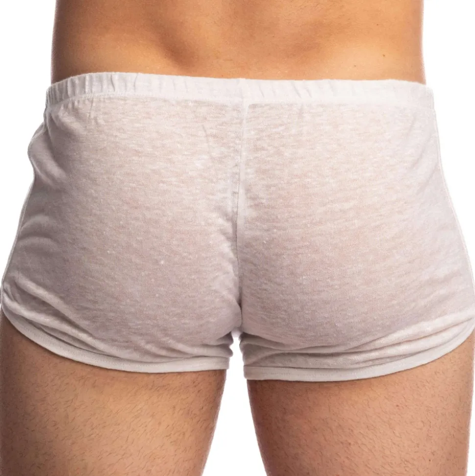 Short court en jersey de lin 100% naturel, léger et confortable. Tissu fluide, respirant et semi-transparent. Coupe taille basse ajustée, échancrée sur les côtés. Fine ceinture élastique recouverte.