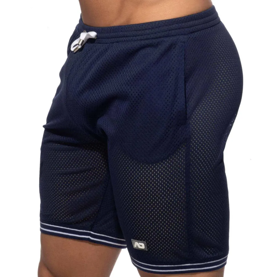Short long en mesh sport, léger et respirant, inspiré du basketball. Ceinture élastique avec cordon de serrage. 2 poches. Bordures des cuisses soulignées par une double bande sport. Poche intérieure Kango pour un grand confort frontal. Logo AD en silicone sur la jambe gauche.