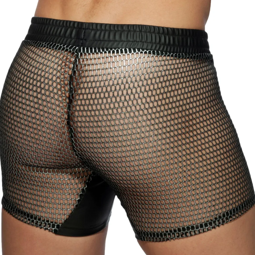 Short fétichiste en mesh métallisé imitant la cotte de mailles. Entrejambe en simili cuir. Poche intérieure Kango pour un grand confort frontal. Anneau métallique pour attacher un harnais (vendu séparément) à la ceinture élastique. Logo Addicted en silicone sur la cuisse gauche.