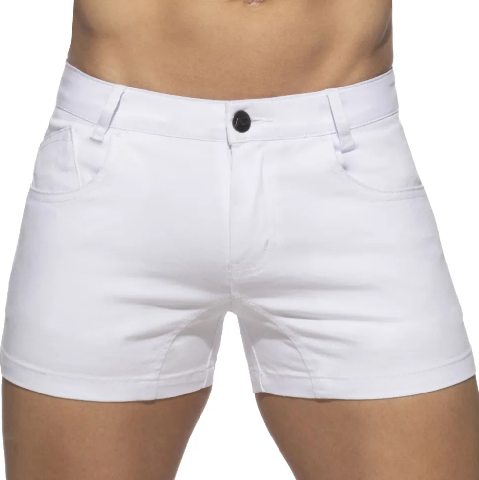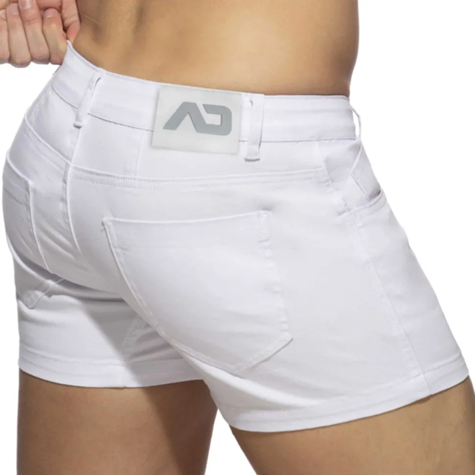 Short court en coton stretch, doux léger et respirant, parfait pour l’été. 5 poches. Passants de ceinture. Coutures style jean. Braguette à bouton et fermeture Eclair. Grand logo AD en silicone à l’arrière.